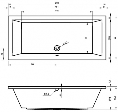 Rechteck Badewanne Luxemburg 200 x 90 x 47,5 cm Acryl 90 x 200 edle DuoBadewanne