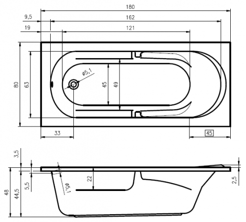 Rechteck Badewanne Frankfurt 180 x 80 x 48 cm Acryl 80 x 180 bequeme Markenwanne