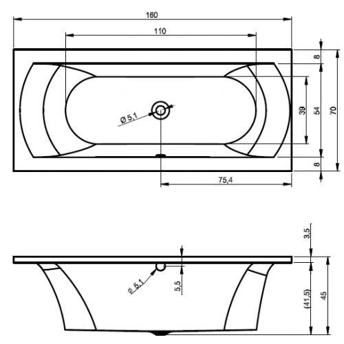 Rechteck Badewanne Lissabon 160 x 70 x 45 cm Acryl 70 x 160 auch mit flachem Rand