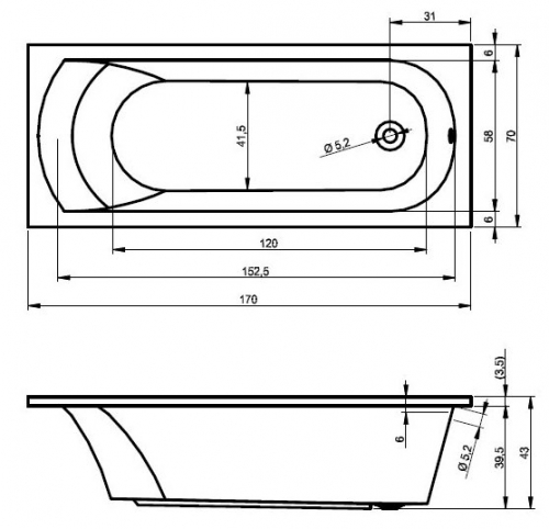 Rechteck Badewanne Mailand 170 x 70 x 43 cm Acryl 70 x 170 Markenwanne