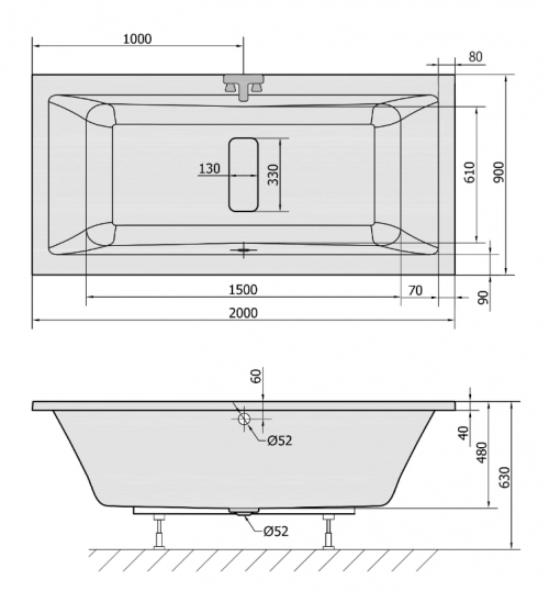 200 x 90 x 48 cm, 422 Liter, weiß, inkl. Ablaufabdeckung wie abgebildet