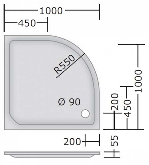 Acryl Viertelkreis Duschwanne "29" 100 x 100 x 2,5 cm (R55)