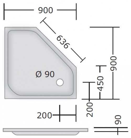 Acryl 5-Eck Duschwanne "36" 90 x 90 x 6,5 cm, Flanke 45 cm