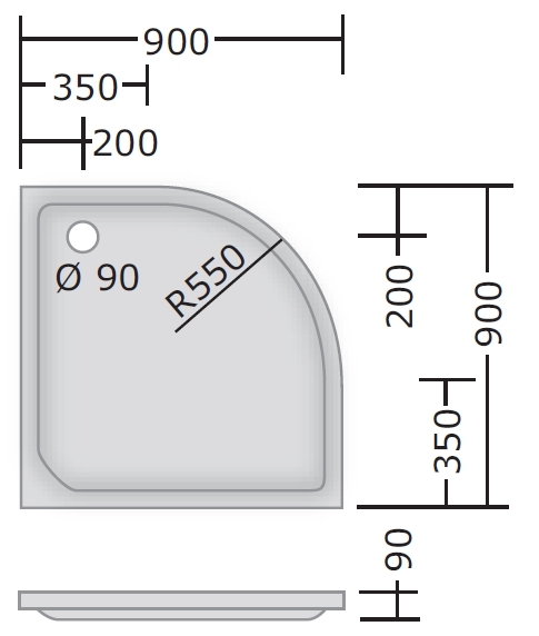 Acryl Viertelkreis Duschwanne "25" 90 x 90 x 6,5 cm (R55)
